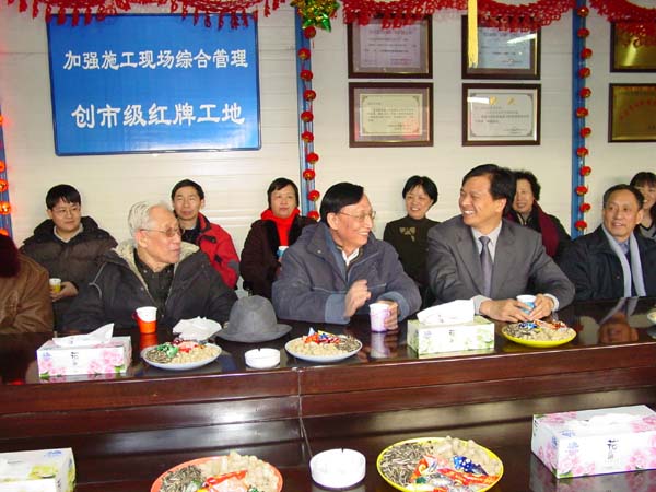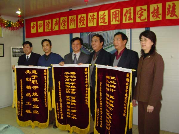 揭碑仪式后,在工地办公会议室各方领导向到会成员简要汇报了工程各方面的主要工作,回顾所经过的风风雨雨,大家一致认为:合作四方团结、真诚、互相理解、互相配合,才会取得今天的成果。为了感谢设计方、施工方、监理方的辛勤劳动,田静所长代表声学所向这三个单位赠送了锦旗。同时田静所长和张仁和院士分别发表了激情洋溢的讲话,对所有为本工程付出辛勤劳动和帮助支持的朋友深表感谢。住宅楼的建成,对留住人才,促进科研,声学所的发展奠定了基础。张仁和院士说得好:安居才能乐业,这次不少35岁左右的年轻人将入住100多平方米的新房,这在我们的那个时代是想都不敢想的,希望他们安居以后,在事业上更要发奋努力,有所建树,为国家建设和声学所的兴旺发达担起自己的责任。