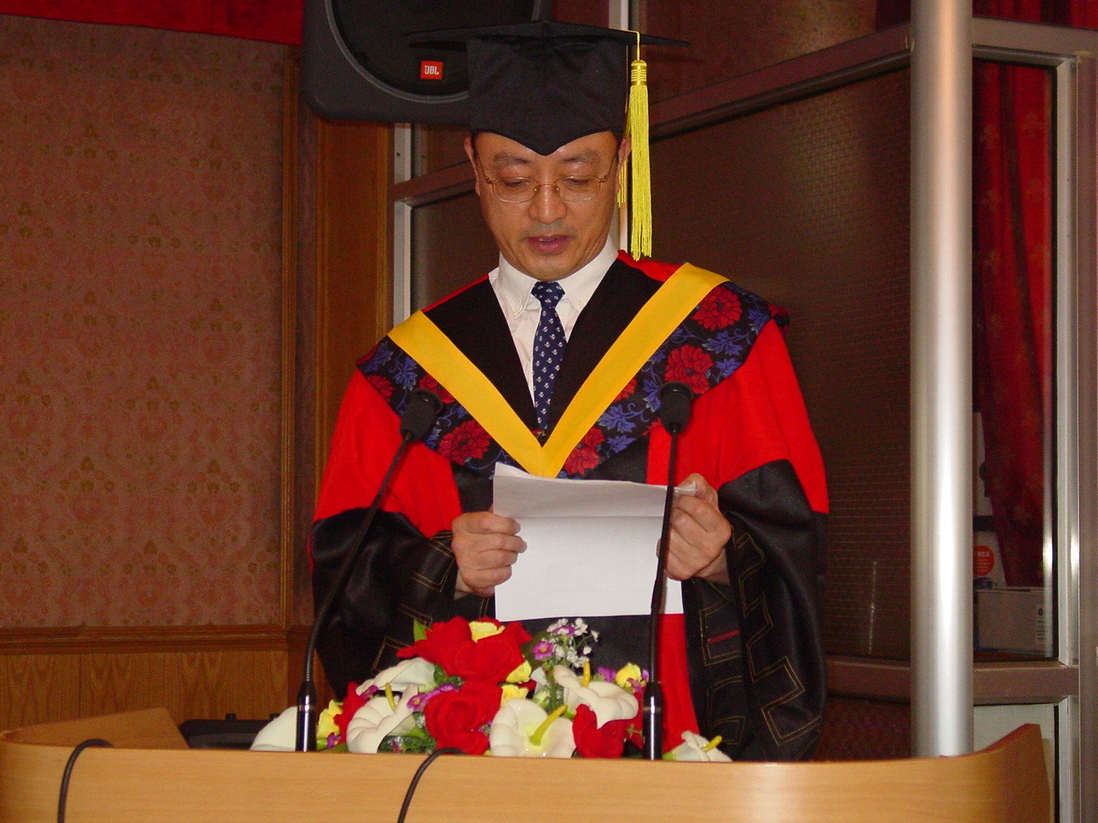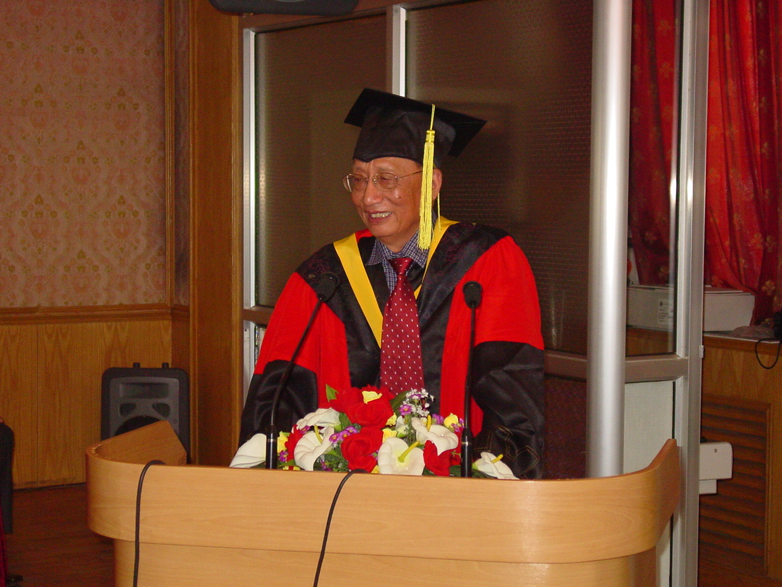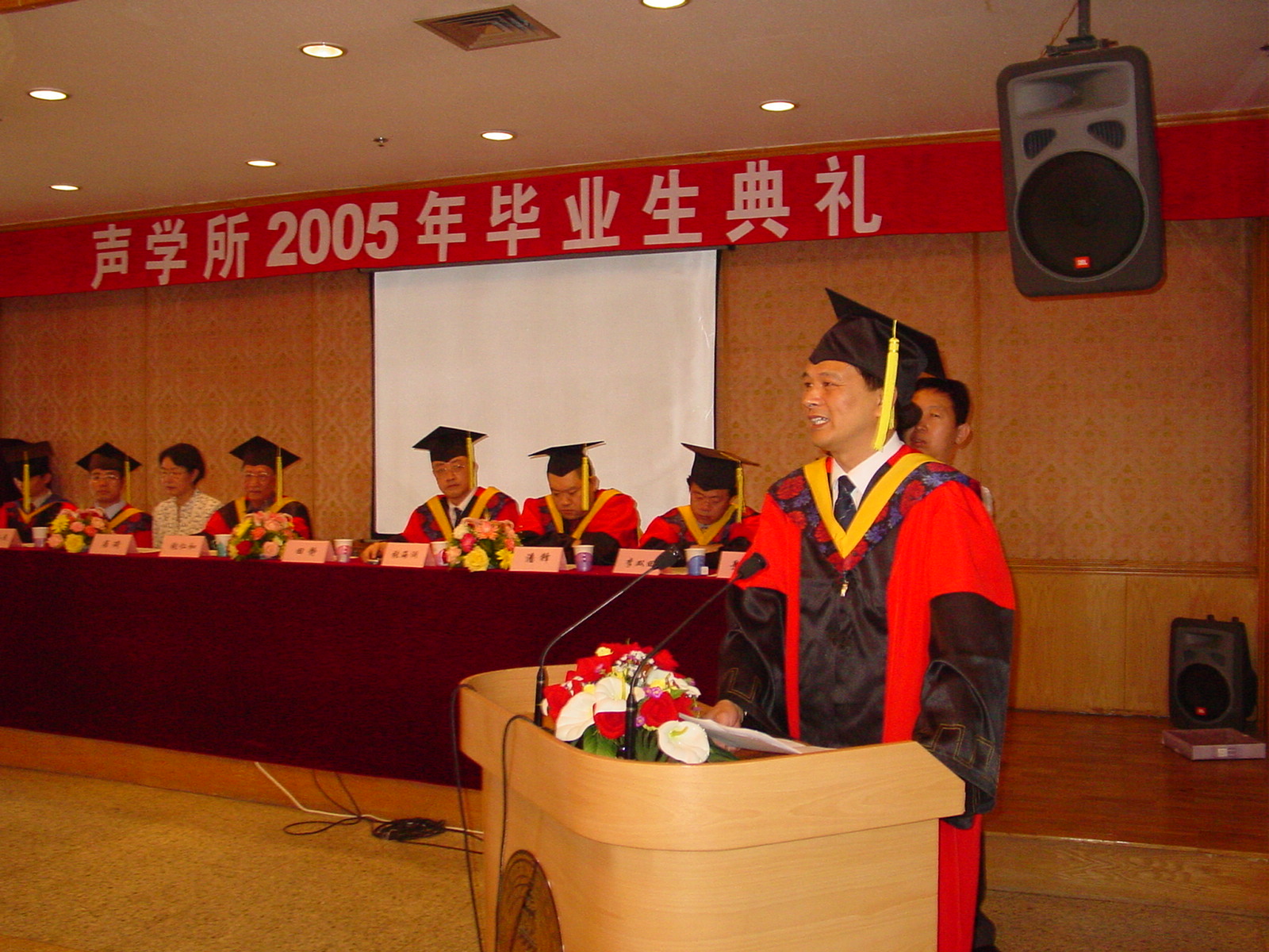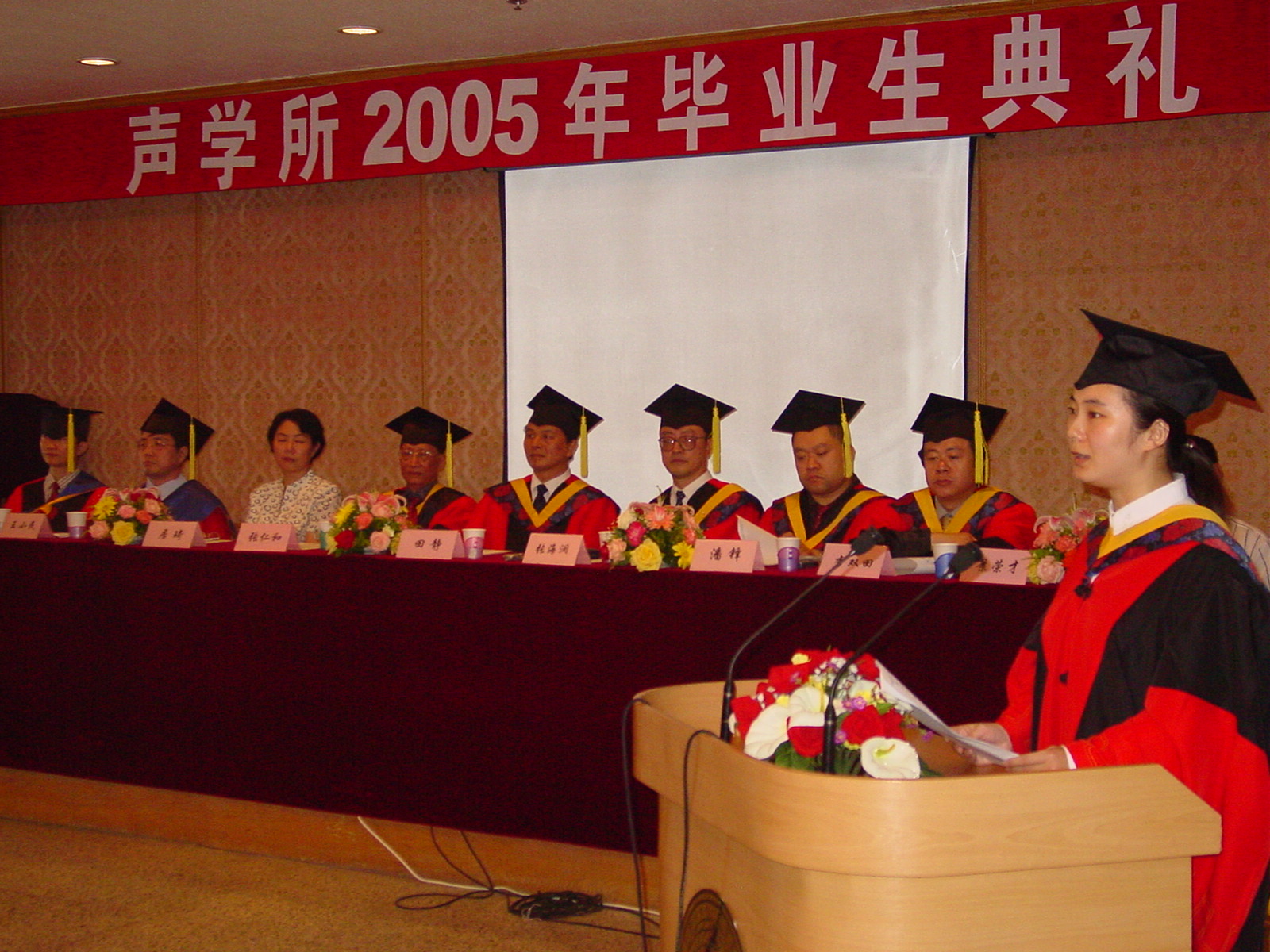 2005 年6月20日上午声学所2005年毕业生毕业典礼在DSP大楼多功能厅隆重举行。在主席台就坐的有所学位评定委员会主席、所长田静博士、张仁和院士、潘峰副所长、居琦副所长、学术委员会主任张海澜博士、所长助理李双田博士、所长助理王小民博士和所学位评定委员会委员肖灵博士等。毕业典礼由景荣才副所长主持。