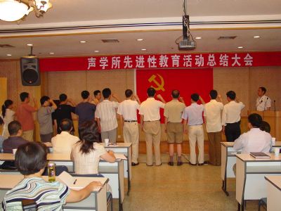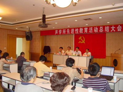 2005年6月30日下午,声学所在DSP大楼四层多功能厅召开了声学所保持共产党员先进性教育活动总结大会。所党委委员、领导班子成员、党支部书记、支委、党员代表100多人参加了大会。京区先进性教育活动中关村北片督导组成员蔡春雷同志莅临大会。所党委副书记、副所长景荣才同志主持会议。