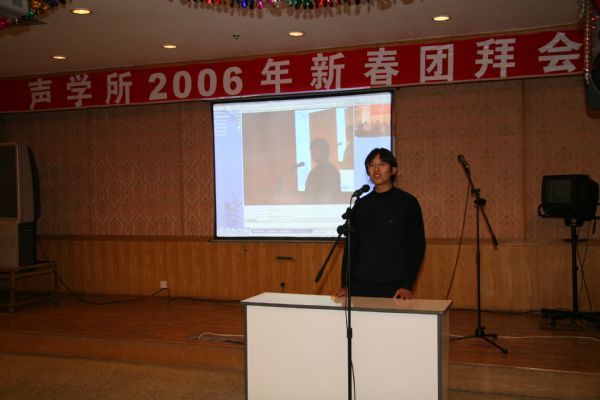 1月20日下午,声学所在DSP大楼四层多功能厅成功举办了隆重而盛大的2006年新春团拜会,并在所网络中心的协助下首次借助视频成功实现了海峡两岸(琼洲海峡)四地(北京所本部及海南南海研究站、上海东海研究站、青岛北海研究站)现场直播。位于北京所本部的主会场共有470余人参加了此次团拜会。声学所所长、党委书记田静,副所长张春华、潘锋、居琦,党委副书记景荣才以及所长助理黄正、李双田、王小民、颜永红等出席了团拜会。南海研究站、东海研究站、北海研究站的主要所领导及职工近百人也通过视频在三个分会场观看了此次团拜会。