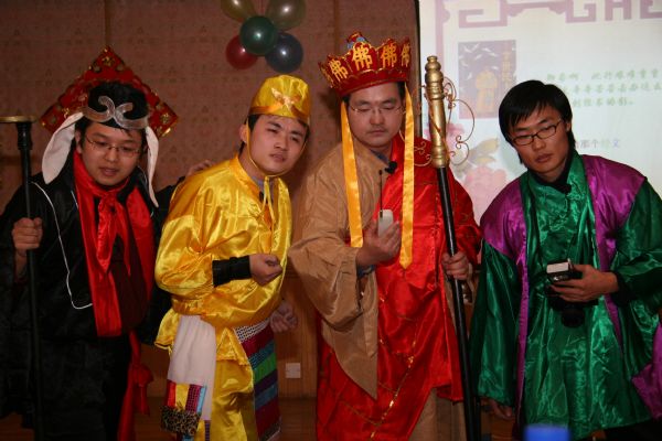 团委书记张云鹏领衔主演的小品《戒色山》可谓本次团拜会的高潮中的高潮。故事以唐僧师徒西天取经为背景,以无厘头的搞笑形式,融合当下流行话题,演绎出了一段荒诞可笑又发人深思的新版西游记。张云鹏饰演的唐僧尤其给大众留下了相当深刻的印象,古板中又透着时髦气息,他那故作深沉的表情实是让人忍俊不禁。编剧加演员冯侦探同学饰演猪八戒,嫦娥一号的发射让这位嫦娥姐姐的爱慕者无比神伤,他那扑闪扑闪的大耳朵和哀怜的表情让观众们开怀大笑。