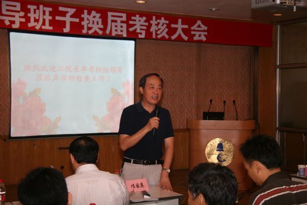 8月12日,中科院声学所行政领导班子换届考核大会在DSP大楼多功能厅举行。中科院副院长江绵恒率人事教育局局长李和风、高技术局局长田静、北京分院党组常务副书记、副院长项国英等考核组12名同志,对声学所行政领导班子进行换届考核。声学所领导班子成员、中层干部、副研及以上科技人员、离退休职工代表等100余人参加了大会。会议由项国英同志主持。