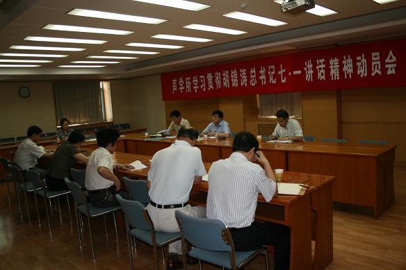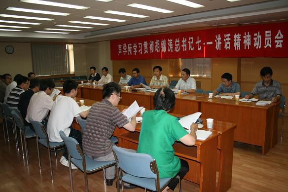 2011年7月7日下午,声学所党政领导班子召开会议,集体学习胡锦涛总书记在庆祝中国共产党成立90周年大会上的重要讲话,畅谈学习体会和认识,并结合“创新2020”等实际工作进行了充分交流和讨论。党委书记张春华主持会议,所长王小民,副书记、副所长倪宏,副所长居琦,副所长马晓川,党委委员孙长瑜、李双田、王秀明、李淑秋和郭良浩参加了学习。