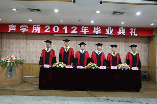 声学所2012年研究生毕业典礼于6月12日上午在DSP大楼多功能厅召开,声学所学位评定委员会主席、所长王小民研究员,学位评定委员会委员田静研究员,学位评定委员会委员、党委书记张春华研究员,副所长、副书记倪宏研究员,学位评定委员副主席、副所长马晓川研究员,学位评定委员会委员李晓东研究员在主席台就坐。王秀明研究员、李平研究员等10余位毕业生导师代表和80余名毕业生及部分毕业生家属们参加了典礼。毕业典礼由马晓川副所长主持。