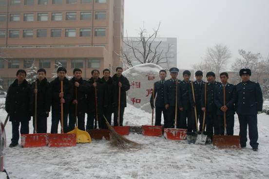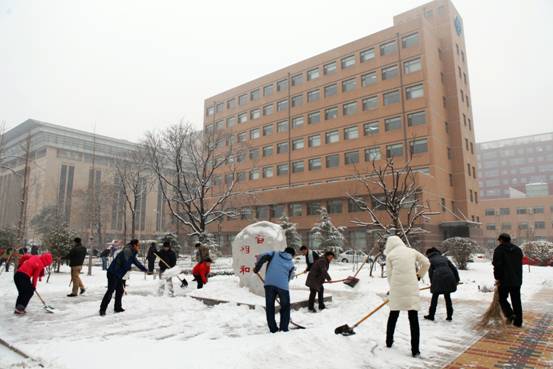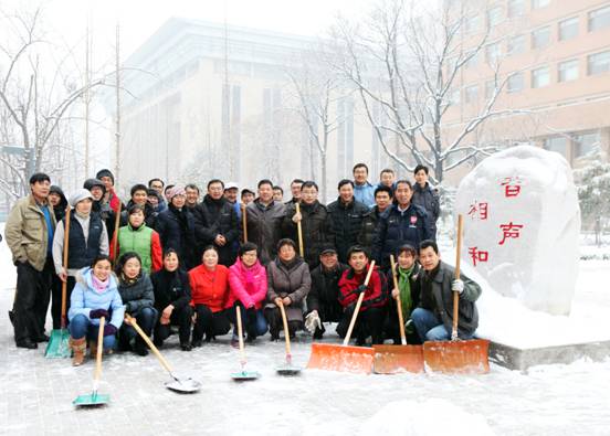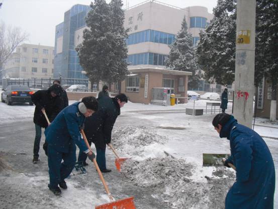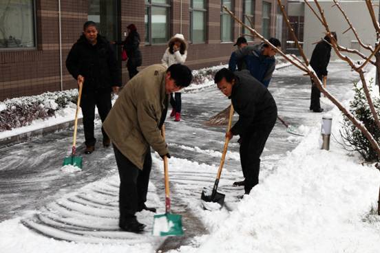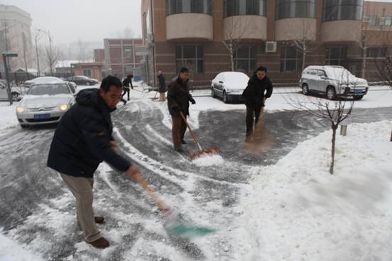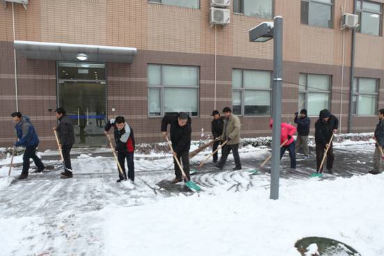 飘飘洒洒的雪花在不断飞舞,但这丝毫都无法影响大家扫雪的热情。环声物业、实验室、机关、团委、党支部,或成建制,或骨干带头,大家不畏严寒,铲冰扫雪。激情会感染,热情会传播,很多同志都是刚到所里,还没来得及放下包,便加入了扫雪的队伍。同志们自觉地三五一组,或铲或推或扫,紧张而有序的工作着。任凭汗水悄悄滑落、冰冷的雪水打湿了鞋袜,大家依然热火朝天,干劲十足。