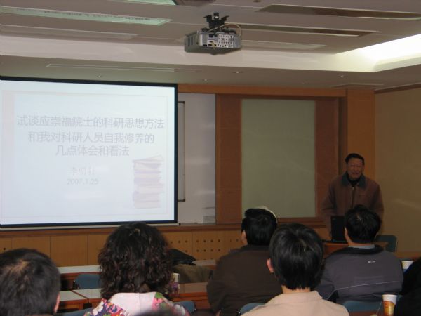 王秀明研究员今年组织开展的系列学术报告,结合今年所里提出的“潜心,2007”的工作主题,让年青的科研工作者全面、系统、深入地看到了老一辈科学家身上的优秀品质和高风亮节,学到了书本上学不到的科研思想方法,明确了提高自我修养、品味、科研素养的方向。这一切都是做好三期知识创新布局工作必不可少的!