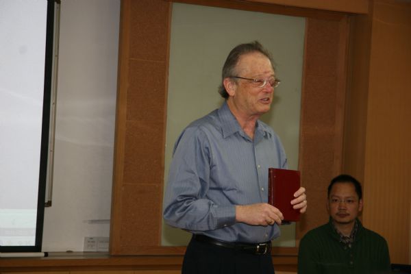 蒙蒙的细雨没有减少大家参加这次交流会的热情,930分报告会正式开始。首先田静所长代表全所教职员工对Stanley M. Flatté教授的到来表示热烈的欢迎,并对Stanley教授进行了简要介绍。Stanley 教授是美国加利福尼亚圣·克鲁兹大学著名物理学教授,同时还为美国物理学会会士、美国声学学会会士、美国光学学会会士,在随机介质中波传播、海洋声学、大气光学、地震学以及数值模拟等方面造诣颇深,并且发表论文和著作120余篇,在多方面做出了突出的贡献。Stanley 教授很高兴看到他的著作 “Sound transmission through a fluctuating ocean”由我所高天赋研究员和尚尔昌研究员翻译成中文版《起伏海洋中的声音传播》,并成为我所图书馆珍贵藏书。