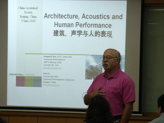 应中国声学学会和中科院声学所噪声与振动实验室的邀请,2010年6月9日下午,阿姆斯壮公司高级首席科学家Kenneth P. Roy博士在声学所德昭楼218会议室进行了一场关于“建筑、声学与人的表现”的精彩讲座。