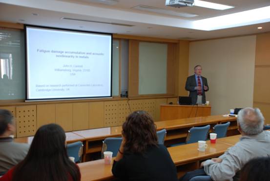 应我所科技处和超声物理与探测实验室的邀请,2010年10月11日下午,NASA资深材料物理学家John H. Cantrell博士在德昭南楼218会议室作了题为“金属中的疲劳累积破坏和声学非线性”的学术报告。