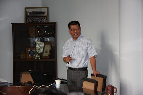 在这次活动中,Lin博士做了题为“Vibration of a clamped ribbed plate”的报告。报告介绍了通过波动法研究加筋板的最新理论结果,演示了加筋板振动模态建模仿真的结果和实验结果的差异性,分析了低频振动的实验结果和仿真结果不吻合的原因是实验中的边界条件不能达到理想的条件,分别给出了理论分析与实验验证的适用频率范围。接下来,Lin博士介绍了其所在小组的另一个主要研究方向,即尝试为燃油机等工业机械设备的故障诊断开发一套较为全面的软件系统。该系统主要分为现场整机故障监测与离线精确故障定位两部分。分别展示了整机监测中应用非均匀转速的优势和精确定位故障位置中超高频分析的有趣现象。该系统已经进行了7年的研究开发,有望在3年后推向市场。