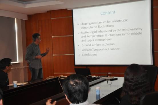 Igor教授展示了其在美国密西西比大学期间的研究成果——声精细分层结构大气中的传播模型,Igor教授从次声波非线性作用机理出发,创新性的建立大气分层精细结构模型。,合理地解释了科学上的奇异现象——声影区探测到次声信号,并通过2006年7月15日厄瓜多尔的Tungurahua火山爆发所产生的次声信号数据验证了该模型的合理性。大气分层精细结构模型已经成为次声远距离传播理论领域中的使用重要模型之一。