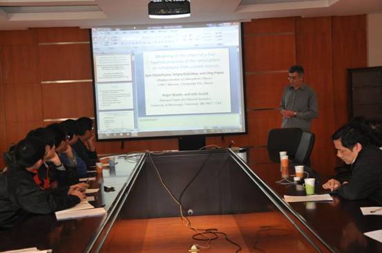 应噪声与振动实验室的邀请,作为中科院外籍研究员计划获得者,俄罗斯大气物理研究所的国际科学家Igor Chunchuzov 教授于2012年4月6日至6月1日期间与中科院声学所的研究人员一起开展次声传播领域的合作研究。作为交流合作内容的一部分,4月26日下午,教授在崇福楼502会议室做了题为“modeling of the effect of a fine layered structure of the atmosphere on infrasound from pulsed sources”的学术报告,所内师生听取了本次报告。噪声与振动实验室主任杨军研究员,科技处黎瑛老师出席了此次报告。杨军主任代表实验室向Igor Chunchuzov教授的来访表示热烈的欢迎,杨亦春研究员主持了此次报告会。