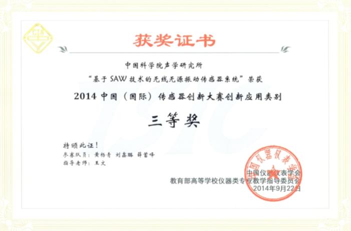 此次大赛以创新为主题,分设“创新设想”、“创新设计”、“创新应用”三个类,由国内外60余位知名院士、专家组成的大赛专家委员会对参赛作品进行了初审、函审、复审,评选出67件优秀作品。声学所微机电实验室提交的基于SAW技术的无线无源振动传感器系统,经过层层选拔和现场答辩,凭借其良好的创新性与实用性获得了评审专家的一致好评,荣获了大赛“创新应用类”三等奖。
