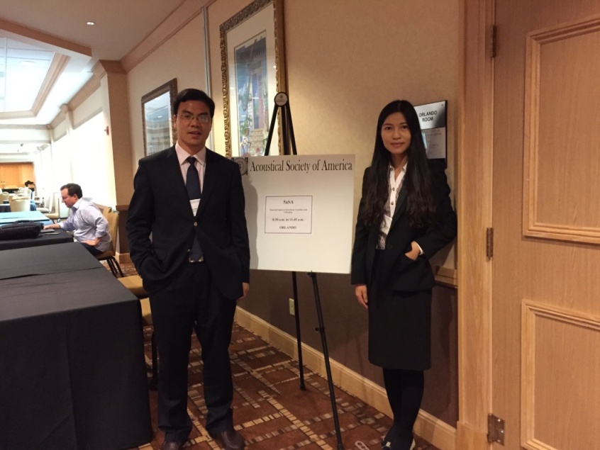 戴郁郁和周吟秋分别参加了物理声学中的“General Topics in Physical Acoustics II”分会和“General Topics in Physical Acoustics I”分会。戴郁郁作了题为“Investigation of low-frequency broadband dipole transducer driving by PMN-PT transverse shear mode”的报告,报告中创新的提出采用一种横向剪切极化的PMT-PT压电材料作为驱动偶极换能器的激励源,一方面可以大大提高换能器在低频处的辐射功率,另一方面改善了传统压电叠片结构,提高其疲劳极限。周吟秋作了题为“The research on piezoelectric cylindrical oscillating transducer for dipole acoustic logging”的报告,介绍了用于电缆测井的一种新型压电式摆动圆柱式偶极换能器的设计方案,通过数值模拟、样机制作和实验测量说明换能器在声波测井应用的有效性和可行性。两个报告均引起了参会的国内外研究学者的广泛兴趣和关注,报告人与在场学者进行了热烈的交流和讨论。