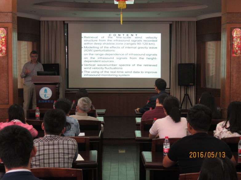 本次“相约东海”系列学术交流会特邀俄罗斯科学院大气物理研究所Igor Chunchuzov教授出席并作题为“Infrasound propagation in the atmosphere in a presence of anisotropic wind and temperature inhomogeneities ”的学术报告,在报告中教授就大气中次声传播的研究背景、应用领域等作了精彩讲演,并重点介绍了近些年的相关研究工作。