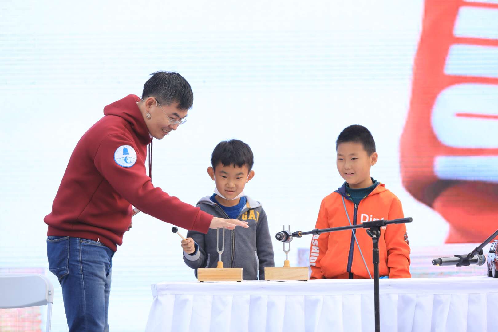 声学所在“嗨剧场”献上科学实验秀《初识声音》。水声工程中心的项目聘研究员张志博以一段弹唱开场,引领观众共同进入奇妙的声音世界,小朋友们上台参与音叉振动、倒车雷达、超声清洗对比等多个科学实验,现场感受声音的力量。