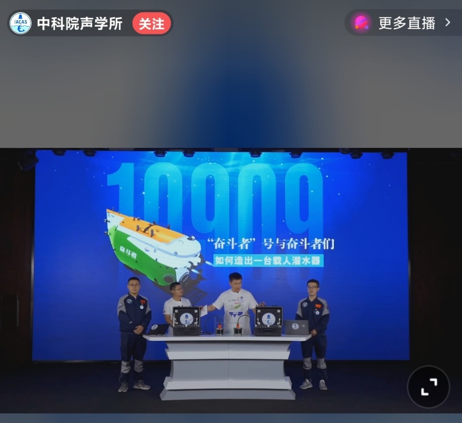 直播活动由中科院声学所研究员张志博主持。来自中科院声学所、理化所、金属所、沈阳自动化所、青岛能源所等多家单位的科学家以直播或连线的形式讲述“奋斗者”号研制背后的故事。