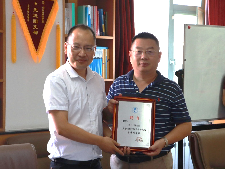 李风华为大家颁发了聘书,感谢他们多年来为声学所发展做出的杰出贡献,希望他们在新的岗位上为研究所发展做出新的更大贡献。