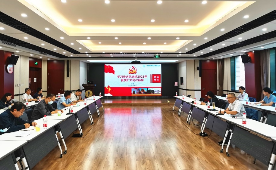 2021年9月6日,声学所党委在DSP楼四层多功能厅召开2021年第六次理论学习中心组(扩大)学习会,深入学习贯彻中科院党组2021年夏季扩大会议精神,围绕牢记“国家队”“国家人”的职责和使命、领会“国家事”“国家责”的内涵和要求等进行专题研讨。所领导班子成员、党委委员、四级职员、机关职能部门负责人、党总支(支部)书记等近30人参加会议。党委书记倪宏主持会议。