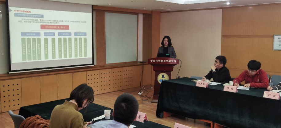 杨军介绍了声学所的基本情况,并对中关村科学城管委会多年来对我所科技成果转化工作方面予以的支持和指导表示感谢。刘宏伟介绍了声学所在科技成果转移转化工作模式和我所成果转化收益分配、奖励机制以及近几年来开展的转化工作情况。