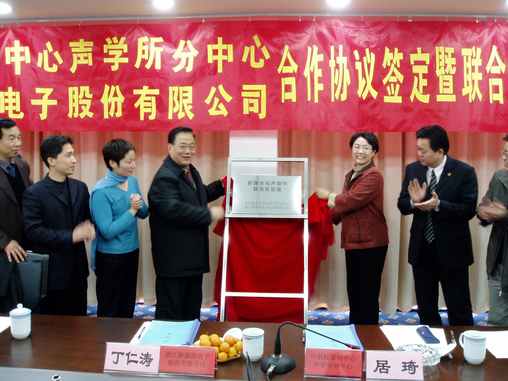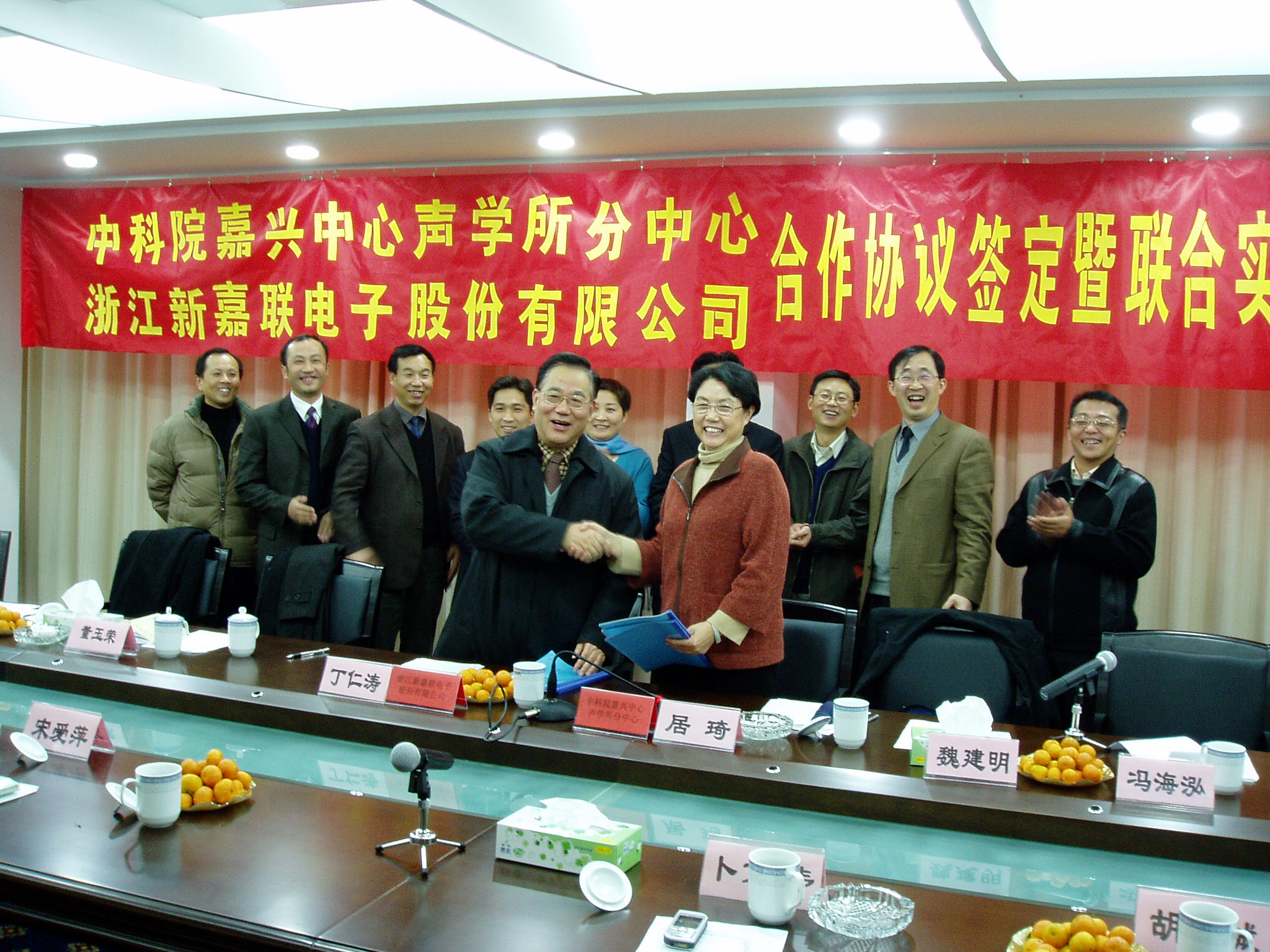 2005年12月18日下午,中科院嘉兴中心声学所分中心和浙江新嘉联电子股份有限公司在嘉兴市南湖创业中心JRC 大楼举行了双方合作协议签字暨联合实验室揭牌仪式。中科院声学所副所长、中科院嘉兴中心声学所分中心理事长居琦女士和浙江新嘉联电子股份有限公司董事长兼总经理丁仁涛先生分别代表双方签订了全面合作框架协议,并为共同组建的“新媒体电声器件联合实验室”揭牌。