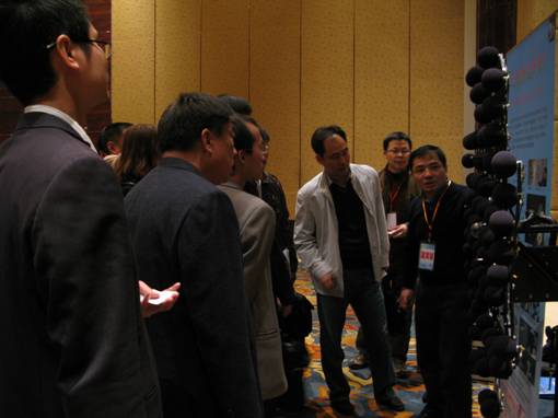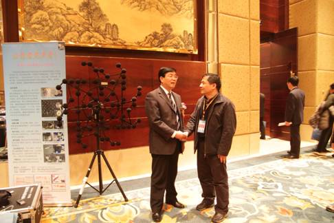 11日下午的技术发布会上,声学所研制的声相仪技术成果在会上作了重点项目发布,和成果演示,杨亦春研究员作了声成像测量技术及声相仪专题报告,详细介绍了声成像技术发展、研究近况和技术应用,公布了我所在此项技术上的最新研究成果——声相仪。报告引起了众多参会代表对声相仪的极大兴趣,纷纷前来咨询情况,杨亦春研究员均一一作出了详细解答和介绍,一时成了会场的热点。洽谈会上青岛隔而固、福田机电等单位均表示和声学所进行技术合作和购买声相仪的意向。青岛海信、青岛海尔等国内知名电器生产企业也特地派研发工程师前来深入了解声相仪的技术性能,在听取了详细介绍后,表示声相仪的出现提供了一种便利和快捷的噪声检测手段,能够快速而准确定位噪声源,为降噪技术改进提供针对性指导,大大方便了研发人员和研发进度,提出了合作愿望和商谈合作模式。