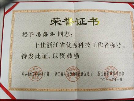 日前,由浙江省委组织部、浙江省人力资源和社会保障厅、浙江省科协联合开展的“浙江省优秀科技工作者”评选活动结束。活动经推荐100名评选人和初审后产生20位候选人,复审后选出10位科技优秀工作者,嘉兴工程中心冯海泓主任获得了“十佳浙江省科技工作者”称号。