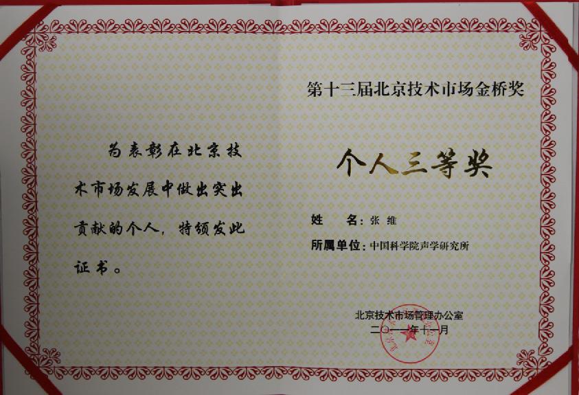 声学所科技处张维同志荣获“第十三届北京技术市场金桥奖”个人三等奖