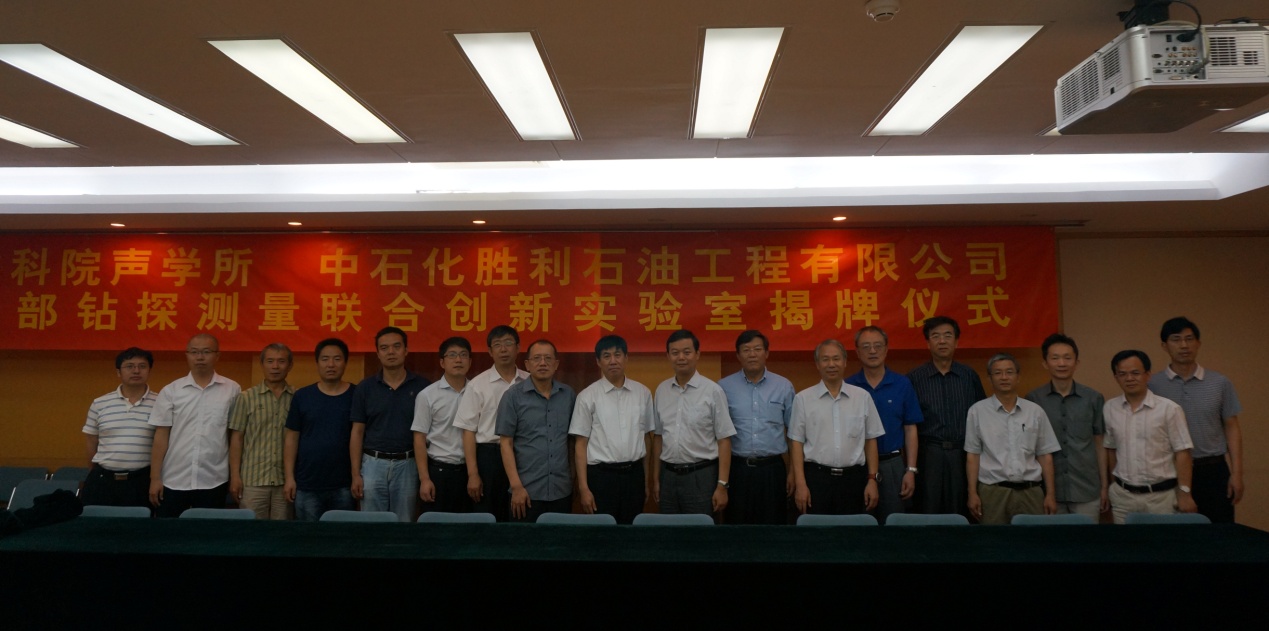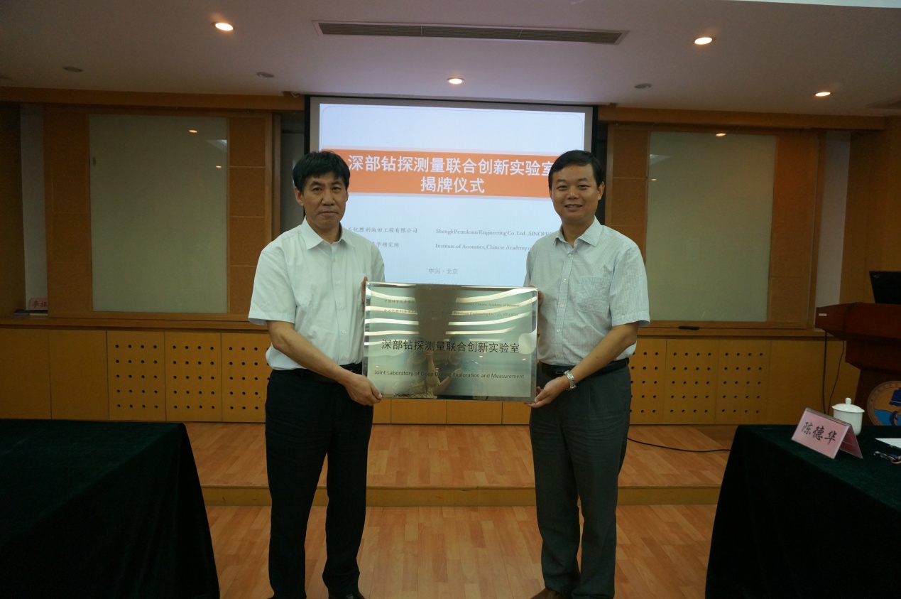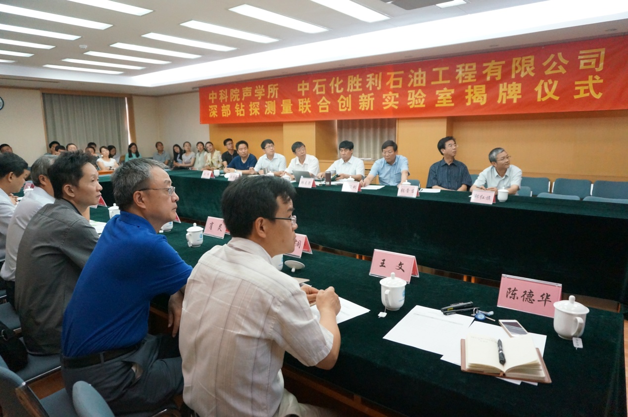 在揭牌仪式上,声学所科技处处长王强首先介绍了参加仪式的双方领导和代表,并对工程公司领导和代表的到来表示欢迎。接下来,声学所陈德华研究员和工程公司朱留方专家分别就声学所及胜利测井公司的概况、主要技术成果与发展方向以及院企合作的成立背景和展望做了介绍。深部钻探测量联合创新实验室的成立是针对我国油气资源勘探与开发的重大需求,开展油气及矿床钻探测量的新理论、新方法与新技术,以及核心部件与新型仪器研制等研究工作,实现科研院所与大型企业的优势互补,着力破解我国油气资源深部钻测中的技术难题,以实现高端技术成果转移与转化,满足现场实际需求;共同打造在国际石油勘探开发领域具有核心竞争力的深部资源与能源钻探测量高科技创新团队,并逐步建立地球探测与信息技术领域高级专门人才的培养基地。