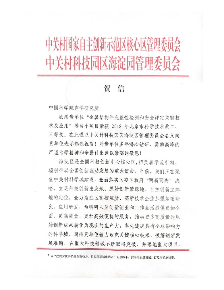 近日,中关村科技园海淀区管委会给声学所发来贺信,祝贺我所张碧星研究员申报的“金属结构件完整性检测和安全评定关键技术及应用”项目荣获2018年北京市科学技术奖二等奖,王文研究员申报的“基于声表面波的快速高灵敏气体传感机理与方法研究”项目荣获三等奖,对我所的获奖项目以及获奖人员表示祝贺!并且对我所多年潜心钻研、勇攀高峰的严谨治学精神和辛勤付出表达了崇高的敬意!