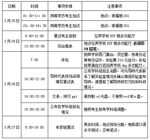 声学所2018年统考硕士复试工作拟于3月25、26、27日举行,具体如下: