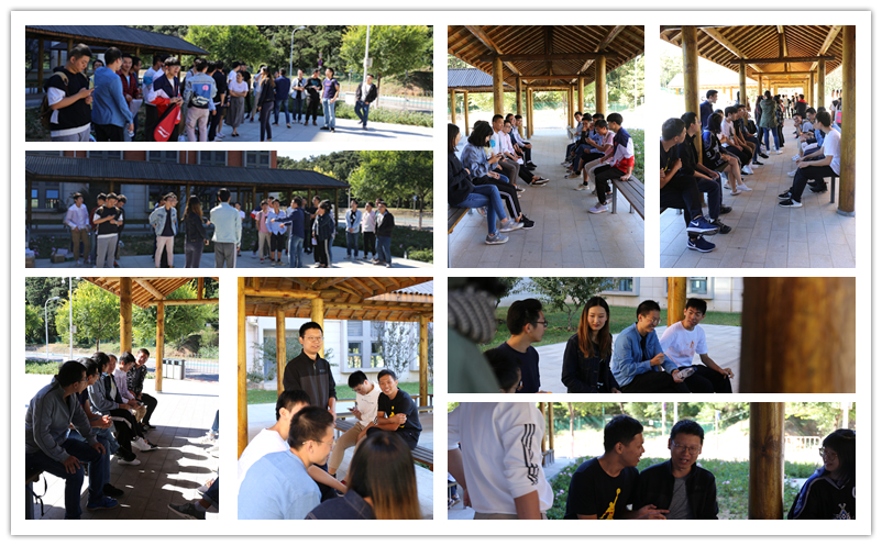 在自由交流环节持续了将近一个小时的时候,活动地点转移到西区宿舍的休息长廊那里,开始进行游戏互动环节。开始之前,研一新生分成三个组,先进行破冰小游戏,相互熟悉。