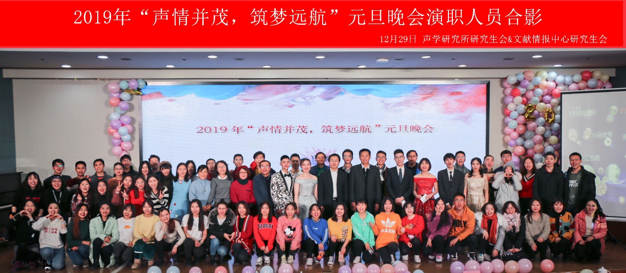 为丰富同学们的文化生活,迎接2019年新年,12月29日晚由声学所研究生会和文献情报中心研究生会联合举办的“声情并茂,筑梦远航”元旦晚会在文献中心报告厅举行。
