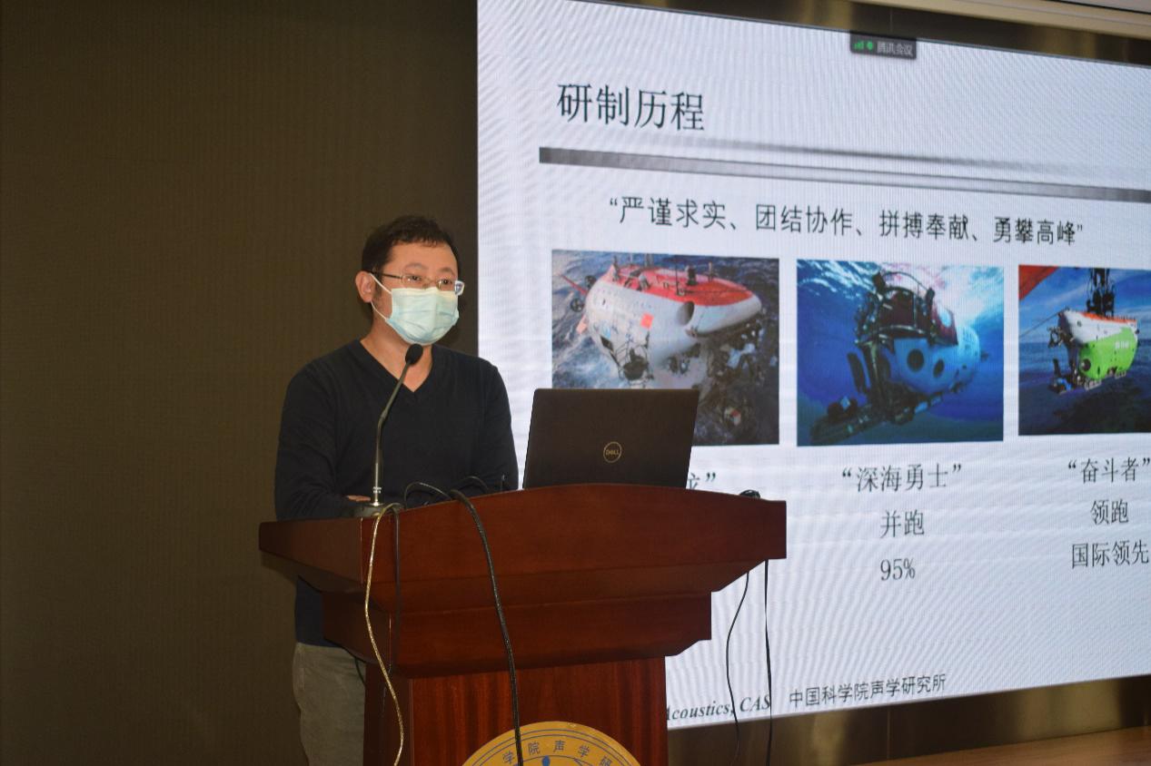刘烨瑶作《我是奋斗者》的主题报告。他介绍了潜水器的发展历史及“奋斗者”号潜水器的研制和海试情况,展示了妙不可言的海底世界。科研人员本着“严谨求实、团结合作、拼搏奉献、勇攀高峰”的精神,通过“蛟龙”号、“深海勇士”号、“奋斗者”号分别完成了载人潜水器研制的跟跑、并跑、领跑,彰显了中国开展大洋考察的综合技术实力,跻身国际深海科考的领先行列。身为“奋斗者”的一员,他感到非常骄傲,更觉未来责任重大。未来将继续牢记使命,不忘初心,为实现中华民族伟大复兴的中国梦继续“奋斗”。