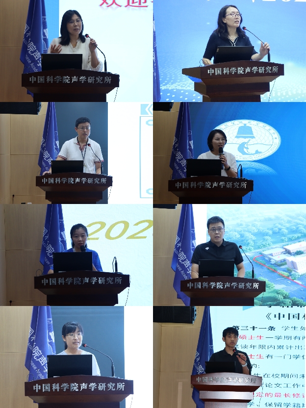 相关职能部门分别介绍了声学所的历史和整体情况、保密工作相关要求、安全注意事项、图书馆和信息化办事流程。研究生部老师详细介绍了培养管理、学籍管理及奖项申报等同学们关心的问题。