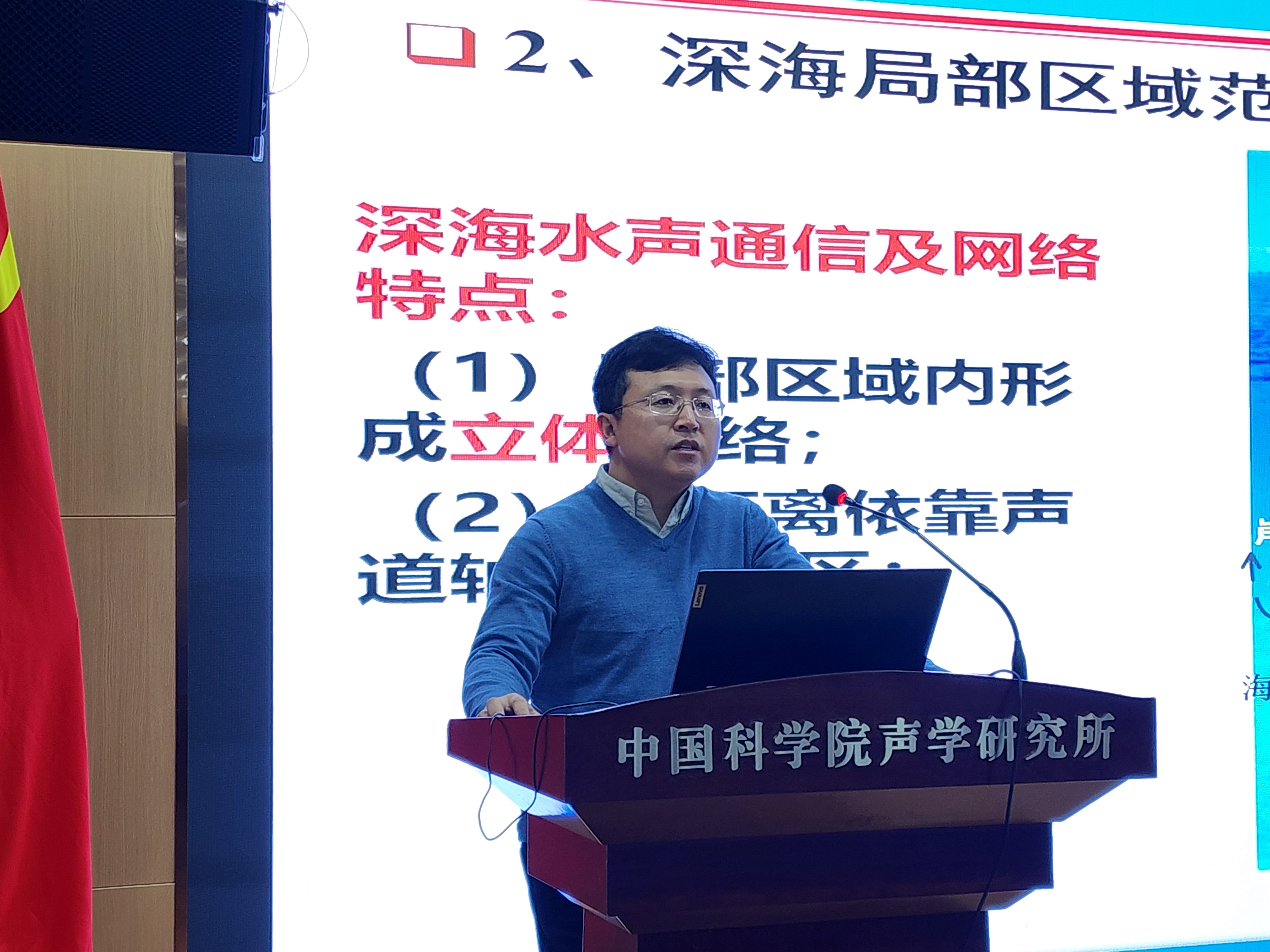 贾宁研究员作《深海中高频水声通信信道特性研究》的报告。他结合实际已开展的实验结果,围绕从该领域目前的研究背景、研究现状、已开展工作以及工作成效等方面,介绍了在长多径时延扩展信道下的水声通信、长信道模型下性能仿真方面取得的成果。