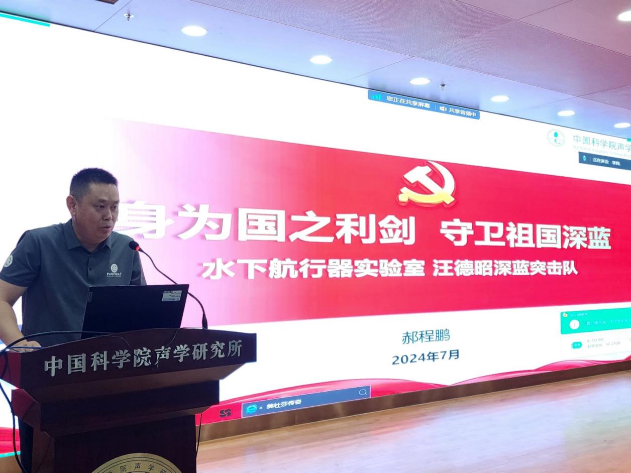 水下航行器实验室主任、“汪德昭深蓝突击队”队长郝程鹏研究员讲授了入所第一课,作了题为《身为国之利剑 守卫祖国深蓝》的专题报告。他介绍了我所老一辈科学家汪德昭院士和侯朝焕院士的科技报国事迹,并讲述了突击队以老一辈科学家为榜样勇闯科学“无人区”的过程。最后,他希望同学们心系“国家事”、勇担“国家责”,传承和弘扬科学家精神,不断为科技攻关抢占科技制高点作出新贡献。