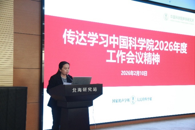 站长、党委书记安俊英首先传达了中国科学院和声学所2026年度工作会议精神,并作北海站2025年度工作报告。她指出,2025年,北海站紧紧围绕声学所年度工作部署和北海站年度工作要点,认真贯彻落实党的二十大和二十届历次全会精神,守正创新,开拓进取,较好地完成了全年工作。