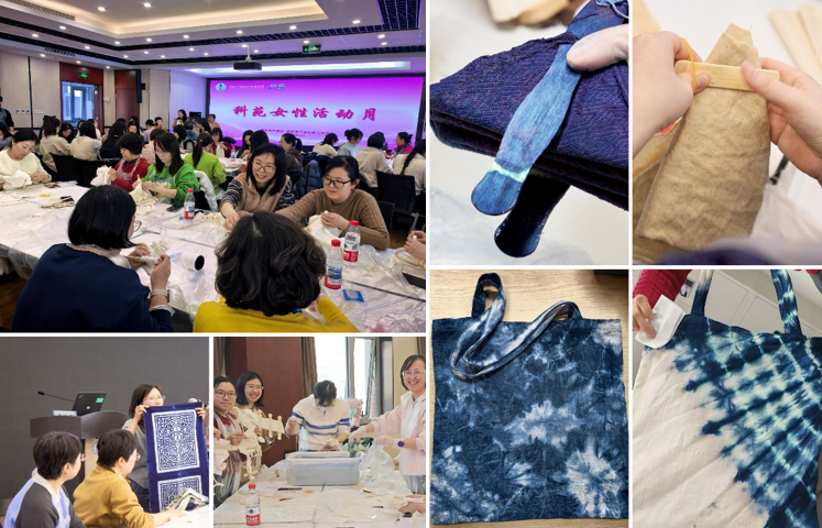 在扎染体验区,活动特邀北京理工大学唐芳老师为大家讲解扎染文化的历史脉络与工艺精髓,并进行现场示范。女职工们围坐案前,聆听细致讲解,从布局折叠、丝线捆扎,到浸染上色、氧化固色,每一步皆融入巧思与创意。一方素布,一缸染液,用夹子勾勒几何纹样,以棉绳缠出细腻纹理,营造出水墨写意的艺术效果。活动现场,大家互相欣赏、交流心得,在非遗的深邃韵味中,不仅体验了手作的乐趣,更感受到文化传承的温度。
