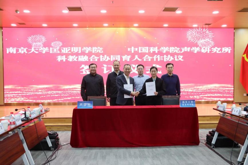 座谈会上,杨军、周媛、鞠艳分别介绍了声学所、体育官网新闻匡亚明学院和物理学院的基本情况,着重交流了各自在重点学科建设、科技创新与人才培育深度融合等方面的实践与成果。李晓东研究员等在声学所工作、学习的体育官网新闻校友结合各自经历,对加强所校合作提出了意见建议。双方围绕深化科教融合、推进拔尖创新人才培养、开展联学共建等进行了深入交流。在前期充分沟通协商的基础上,库卫群、周媛分别代表声学所和体育官网新闻匡亚明学院签署了《科教融合协同育人合作协议书》。